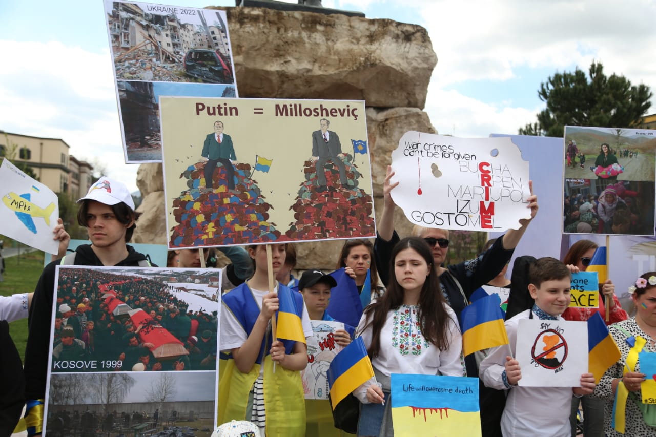 Me flamuj të Ukrainës në duar, protestuesit solidarizohen me ukrainasit në këtë periudhë të vështirë. Kjo protestë përkon me ditën e 44 të nisjes së pushtimit rus. Policia ka devijuar edhe qarkullimin e automjteve në disa rrugë të kryeqytetit.