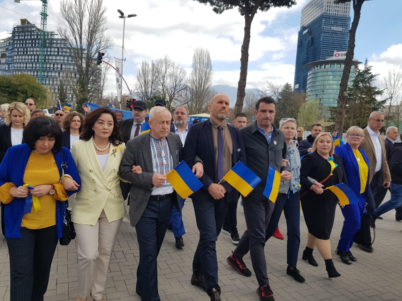 Ambasadorja e SHBA-ve në Tiranë Yuri Kim i është bashkuar manifestimit të nisur në sheshin Skëndërbej, që do të shtrihet më pas në disa rrugë të Tiranës në mbështetje të Ukrainës. Ajo marshon krah kryebashkiakut të Tiranës, Erion Veliaj.