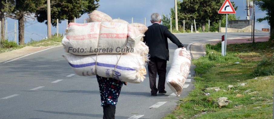 Një grua e lidhur në kurriz me katër thasë shtroje për bagëtinë, udhëhiqet nga bashkëshorti i saj teksa kthehen për në shtëpi në zonën e Dajtit,...