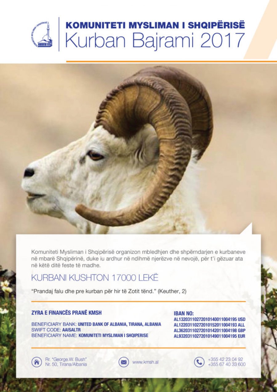 Kurban Bajrami është më 1 Shtator 2017 Komuniteti Mysliman i Shqipërisë njofton besimtarët se dita e parë e Kurban Bajramit është më 1 Shtator 2017. Komuniteti Mysliman...