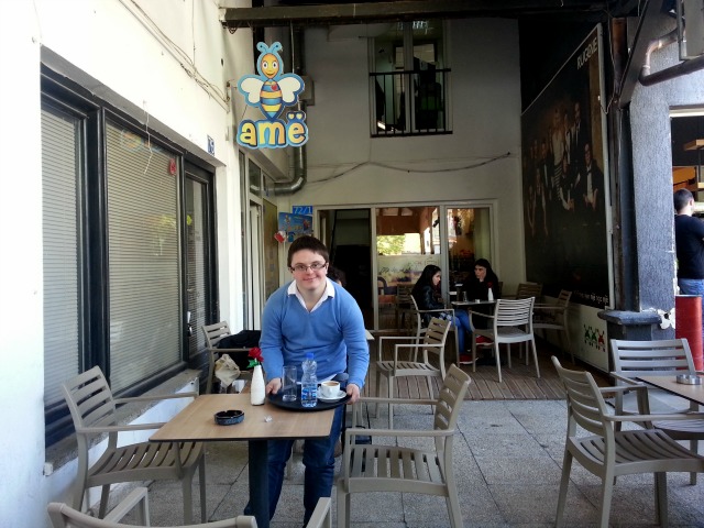 Aldi Hoxha, 20 vjeç tek Bar X21, Foto: BIRN Kafeneja Bar X21 në Prishtinë, ku pjesa më e madhe e stafit janë të rinj me sindromën...