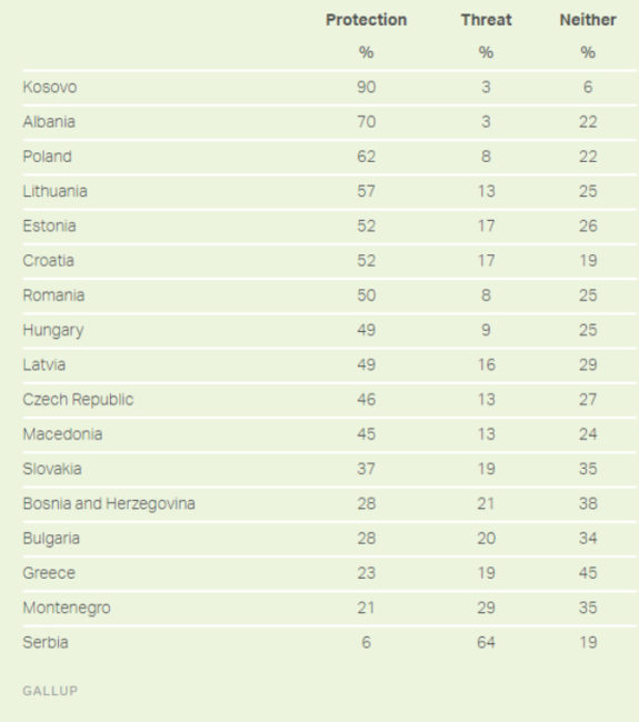 Sipas një sondazhi të realizuar nga kompania kërkimore Gallup, shqiptarët e Kosovës (90%) dhe të Shqipërisë (70%) e shikojnë Aleancën e Atlantikut të Veriut si mbrojtje,...