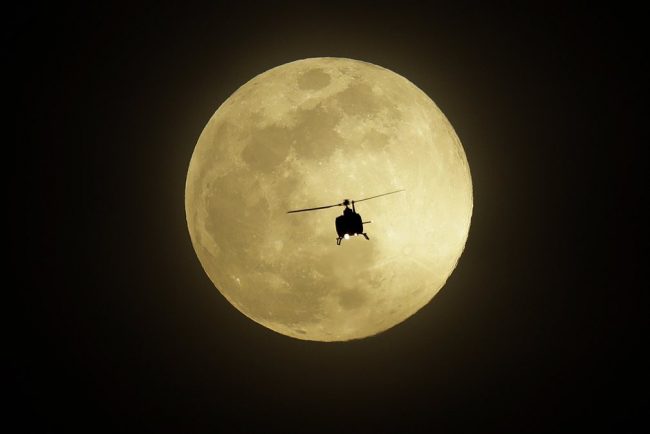 Silueta e një helikopteri, kapet nga fotografi teksa fluturon me hënën e plotë në sfond, në Las Vegas, Nevada, të Shteteve të Bashkuara të Amerikës. Photograph:...