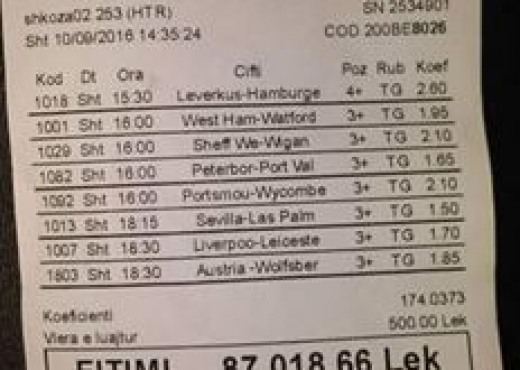 Një biletë fituese në vlerën e 870 mijë lekëve të vjetra është kapur nga një i ri shqiptar. Vlen tëtheksohet se i riu kishteparashikuar saktë golat...